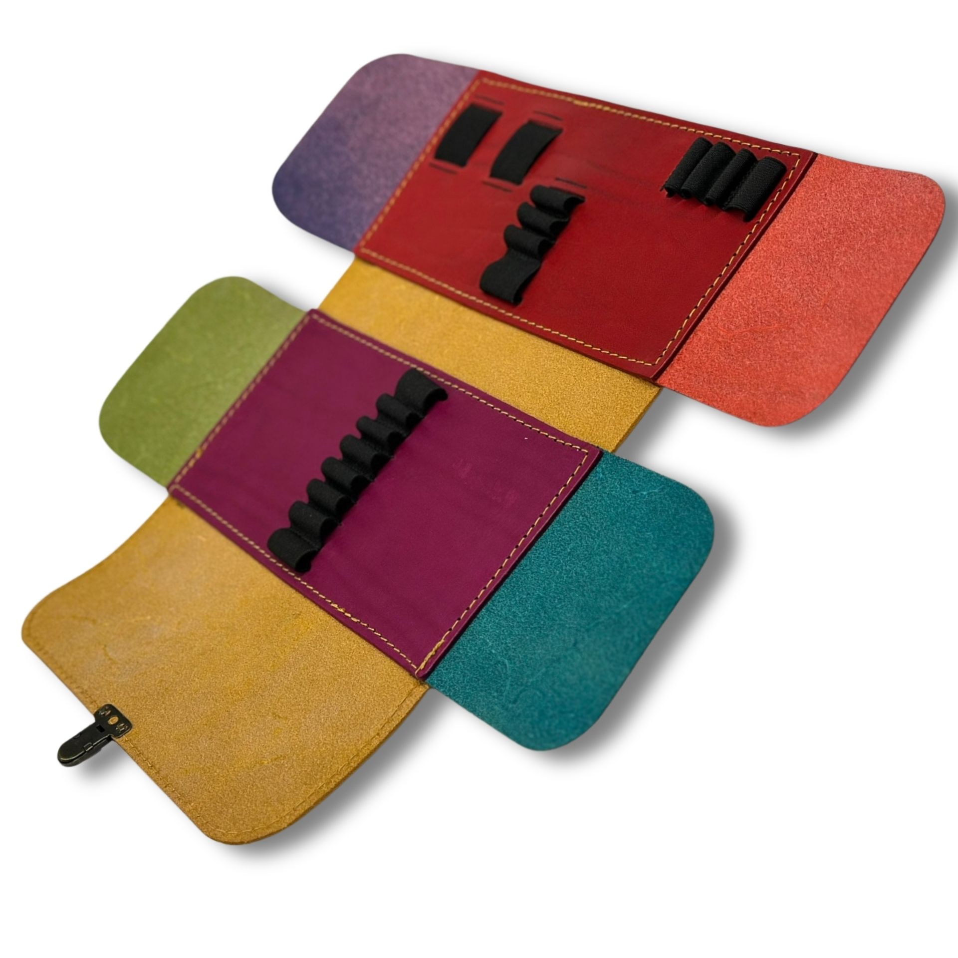 Das Mäppchen wird mit einem Steckverschluss geschlossen, die seitlichen „Ohren“ verhindern das Rausrutschen der Utensilien.