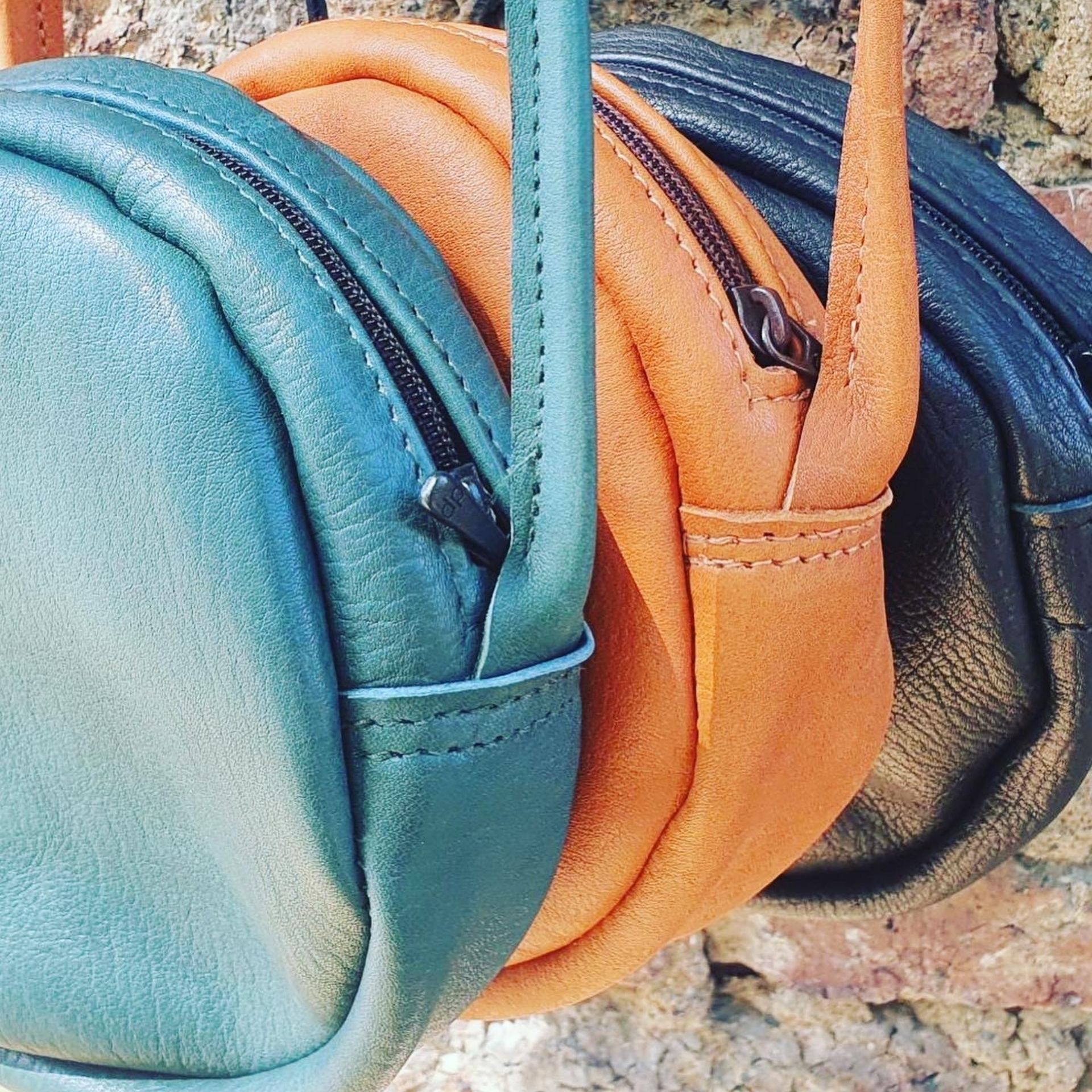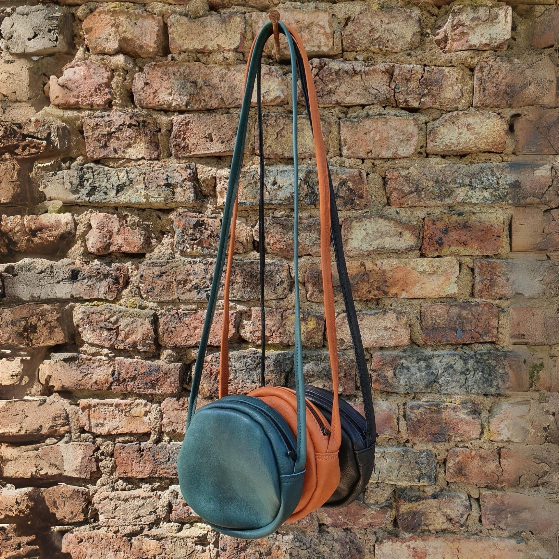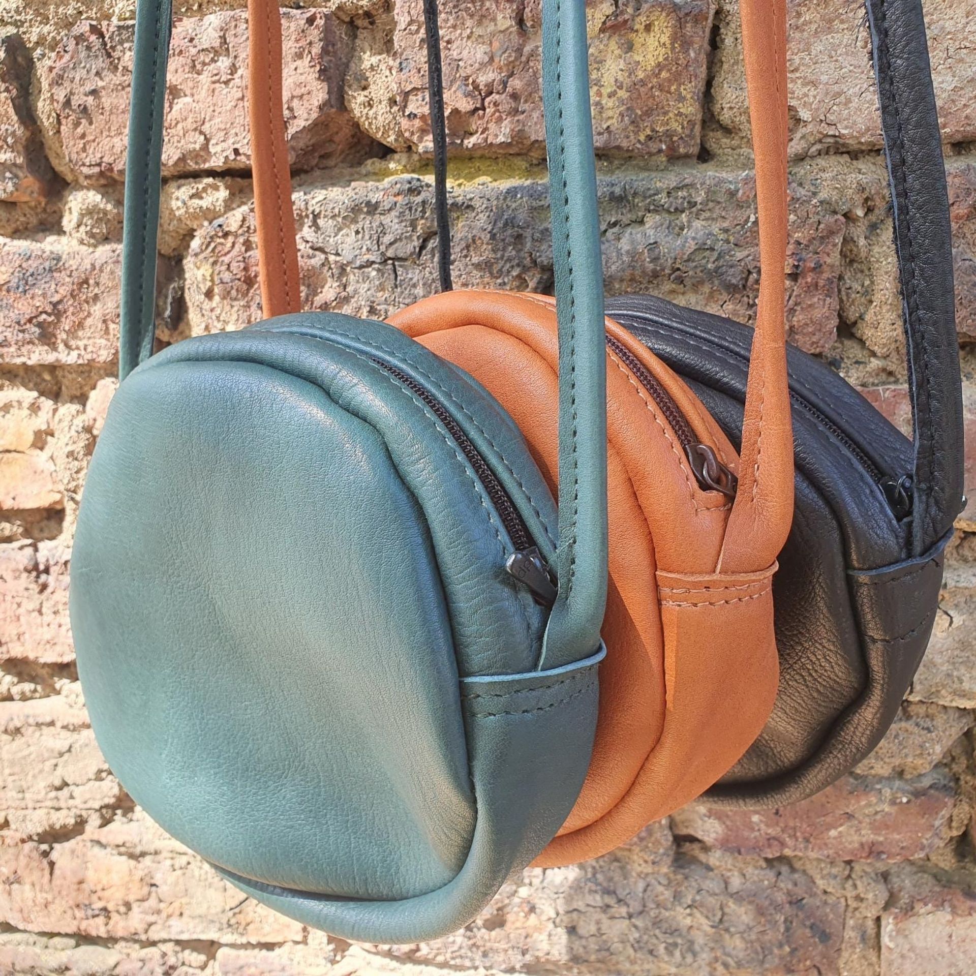 Unsere Ledertasche in runder Form (Circle Bag), mit Reißverschluss zum Umhängen.