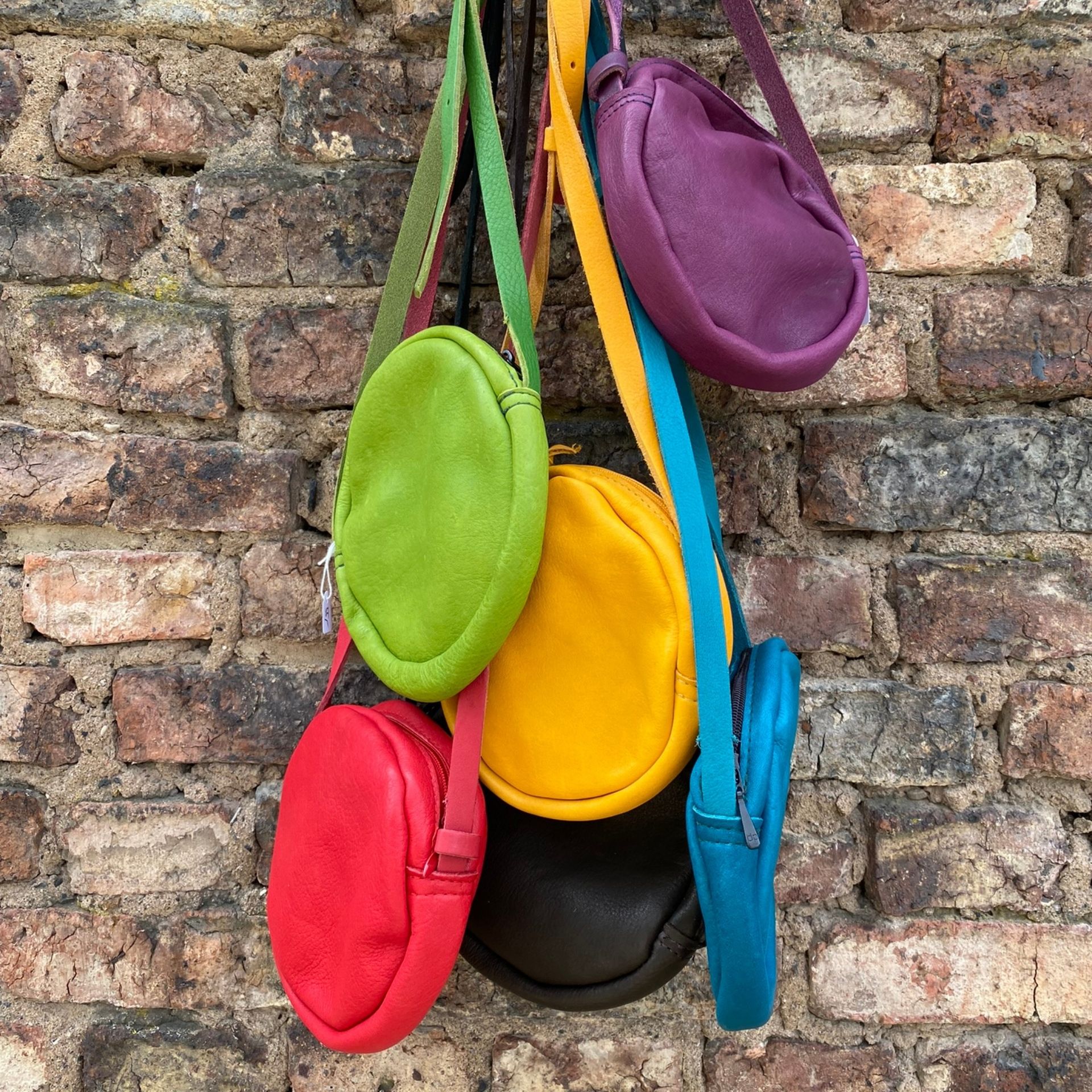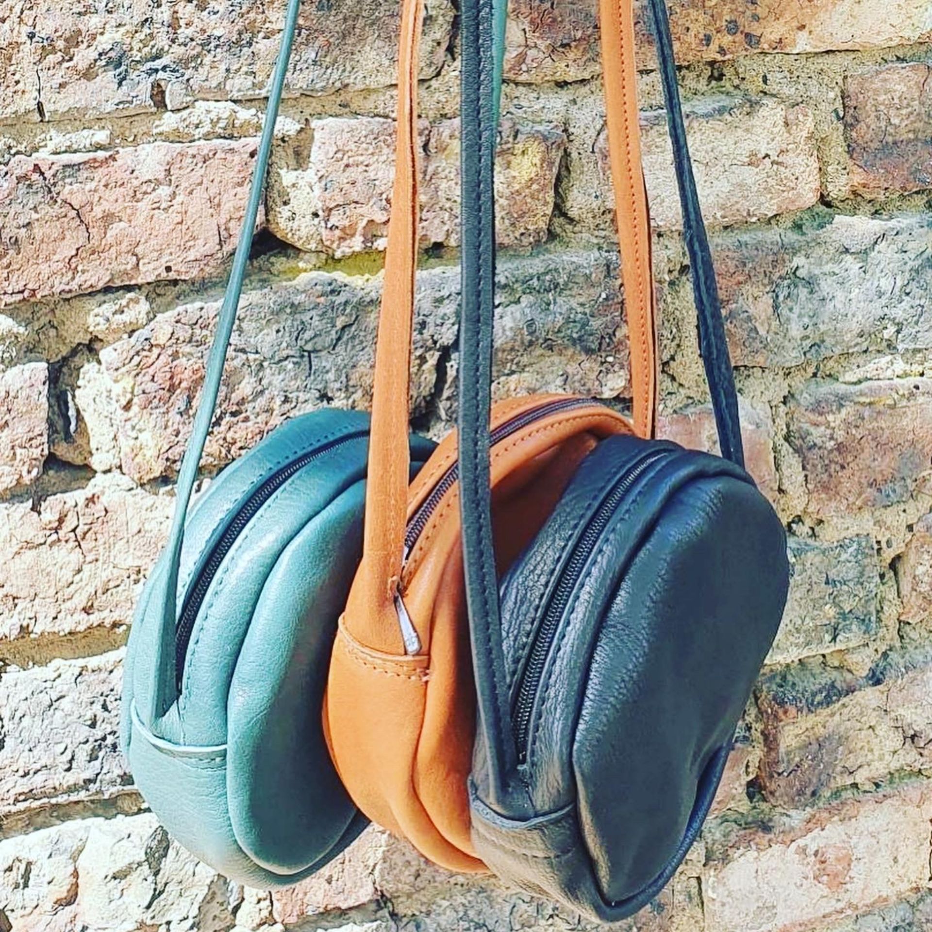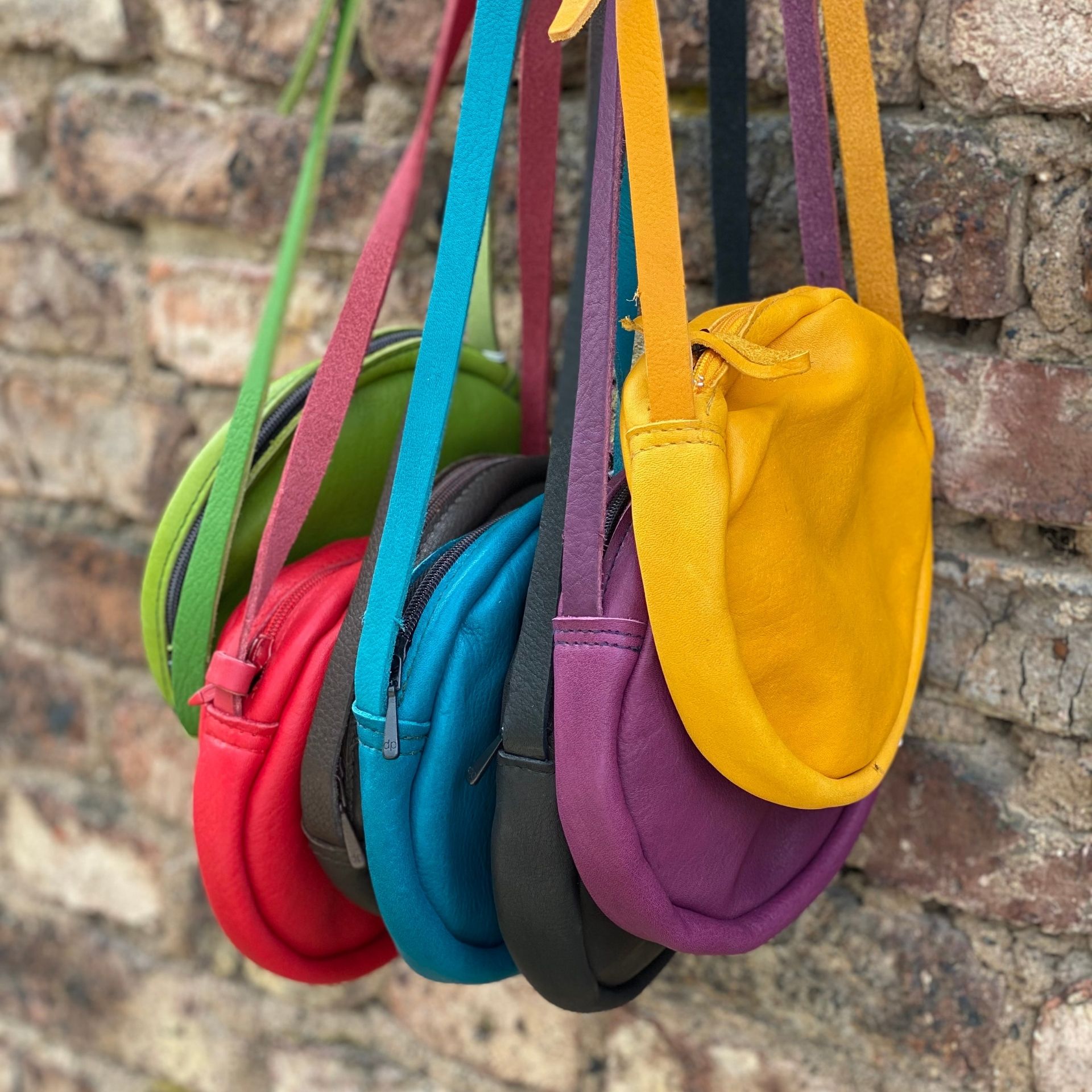 Unsere Ledertasche in runder Form (Circle Bag), mit Reißverschluss zum Umhängen.