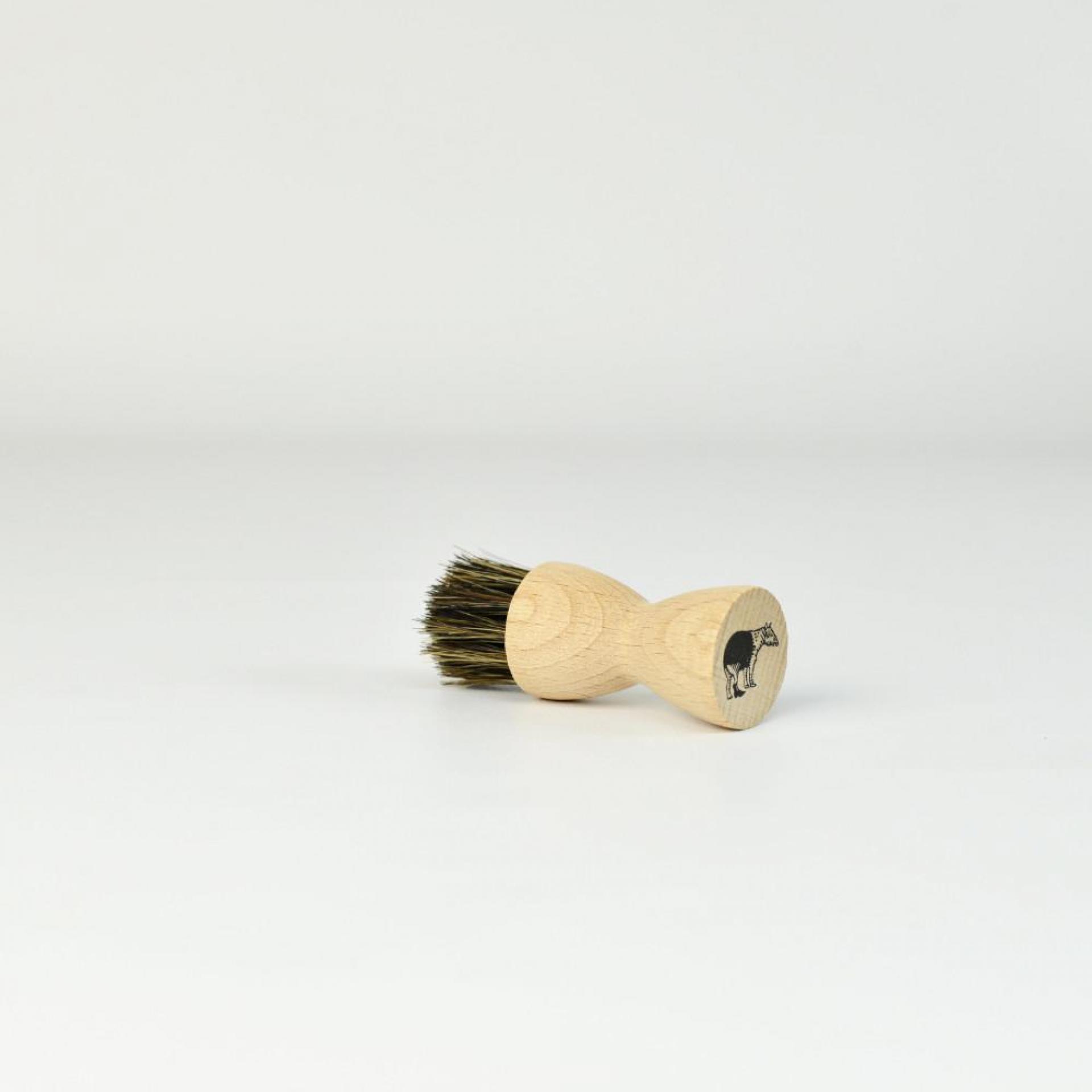 Ein richtiger Handschmeichler, die runde Auftragsbürste aus Rosshaar. Handlich geformt eignet sich die Bürste wunderbar, um die Produkte von Tapir gleichmäßig aufzutragen. In kreisenden Bewegungen wird das Pflegeprodukt in das Leder einmassiert. Zur regelmäßigen Verteilung und zum erreichen der Nähte und Ränder der Tasche oder des Schuhs besonders geeignet.