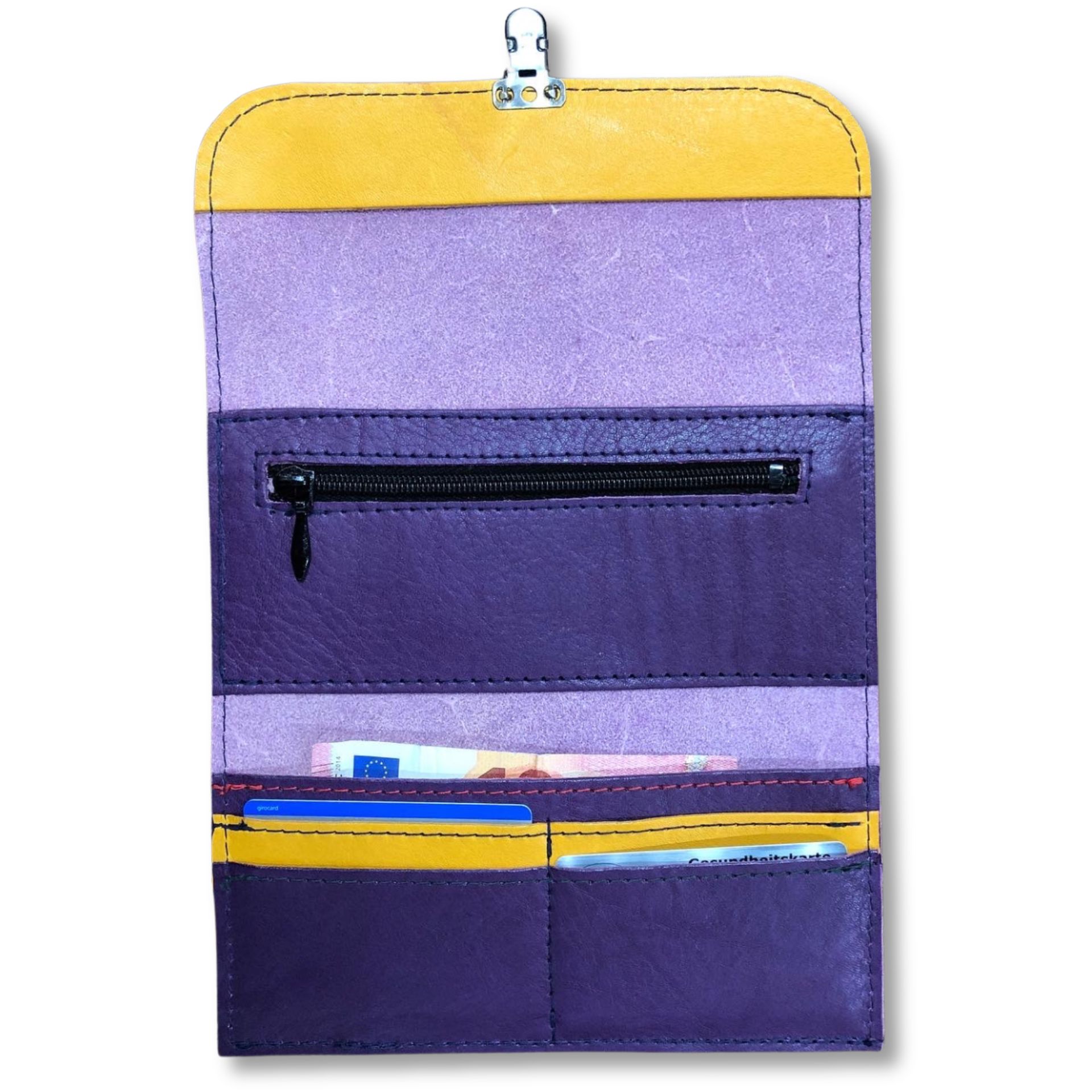 Das Portemonnaie lässt sich komplett aufklappen, es hat sechs Kartenfächer, ein Geldscheinfach und ein Kleingeldfach mit Reißverschluss.