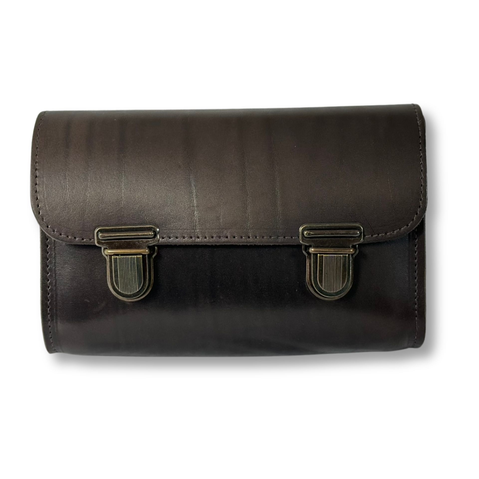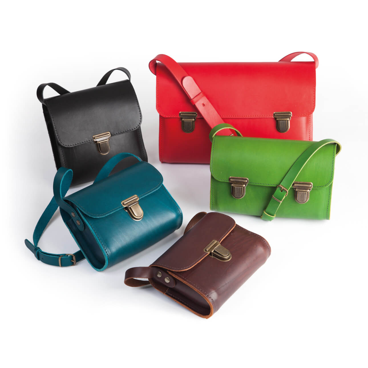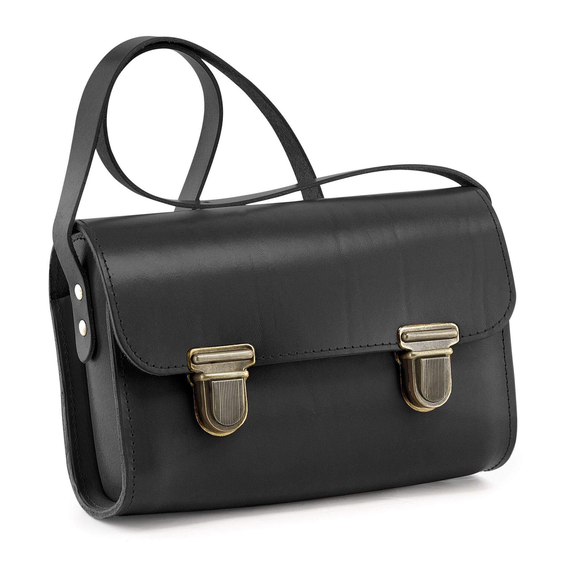 Aus festem Glattleder, mit zwei großen Steckverschlüssen, Innenfach und langem, verstellbaren Umhängeriemen.